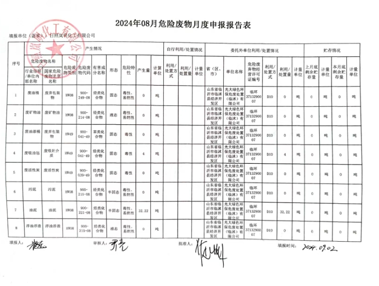 2024年8月危险废物月度申报报表