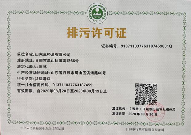 公司依据《排污许可证申请与核发技术规范码头(HJ 1107—2020)》及相关规定,于2020年8月20日取得排污许可证;