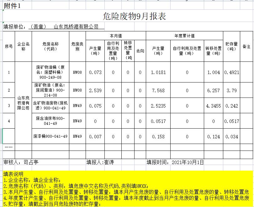 山东岚桥港有限公司10月份危险废物公开信息表