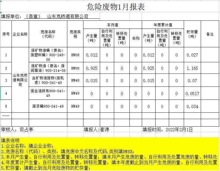 日照岚明化工有限公司危险废物2022年1月报表
