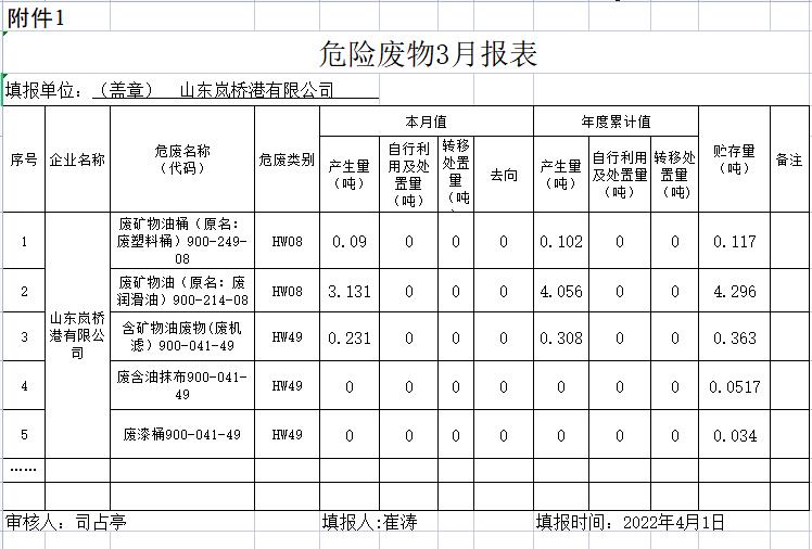 山东岚桥港有限公司2022年3月份危险废物公开信息表