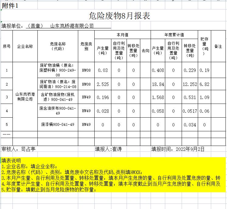 山东岚桥港有限公司2022年8月份危险废物公开信息表