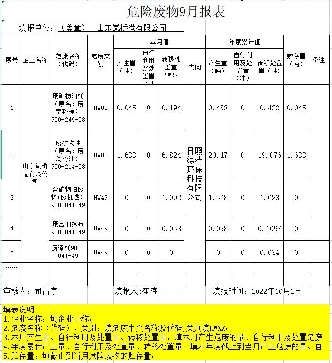 山东岚桥港有限公司2022年9月份危险废物公开信息表