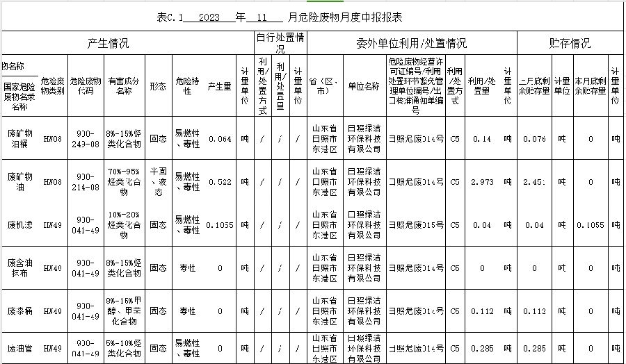 2023年11月危险废物月度申报报表